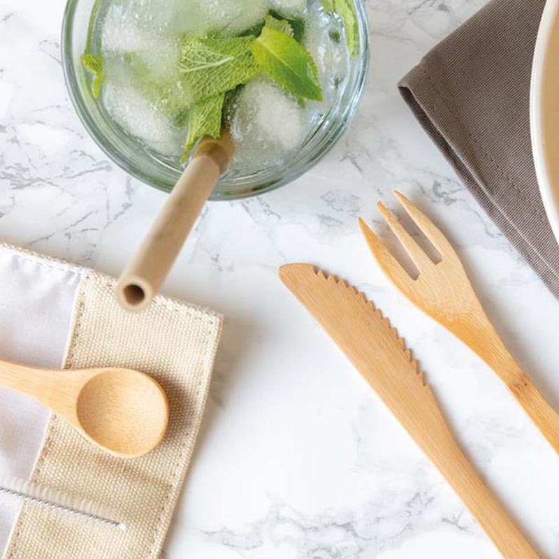 Ce set de couverts en bambou personnalisable comprend paille, fourchette, cuillère et couteau, compostables et réutilisables, dans une pochette en polyester, avec un goupillon pour nettoyer la paille.
