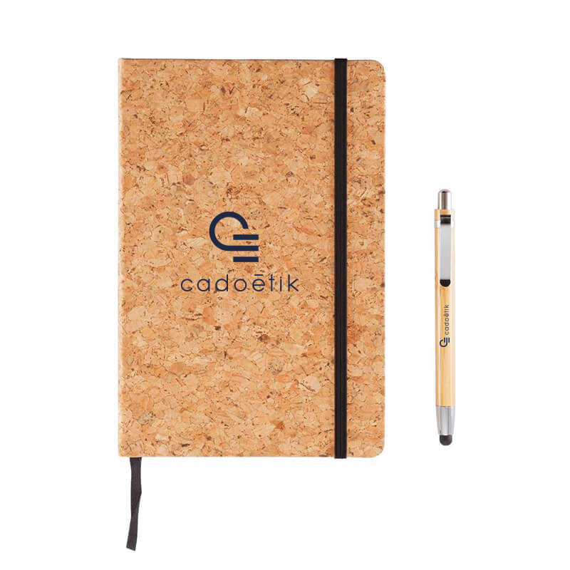 Ce carnet A5 personnalisable avec sa couverture en liège, contient 160 pages lignées, un signet noir, un élastique de fermeture, ainsi qu’un stylo en bambou, qui fait aussi stylet.