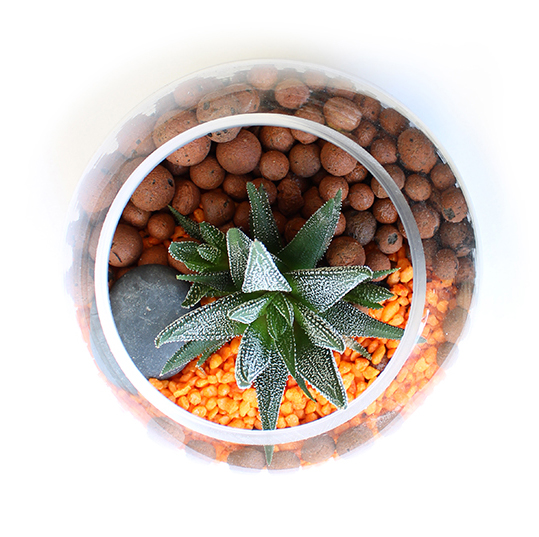 Le kit comprend une sphère en verre, une mini plante dépolluante, des billes d’argiles, du terreau, et des graviers de couleur.