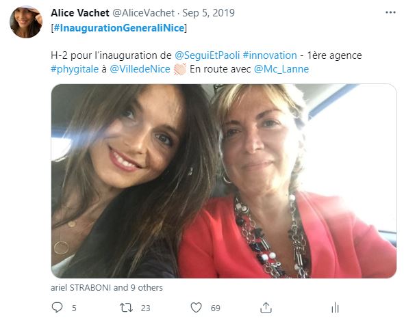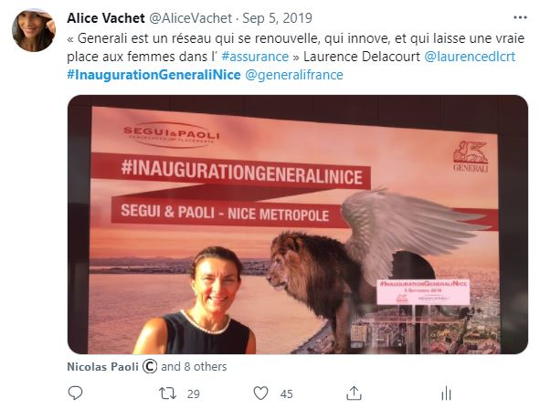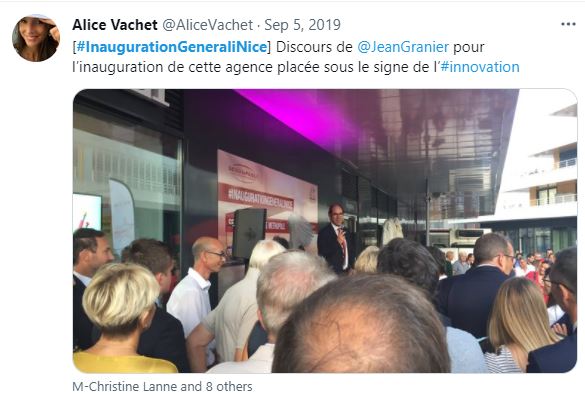 05/09/2019 – A l’occasion de l’ouverture de nouvelle agence phygitale Segui & Paoli de Nice, Alice Vachet s’est rendue sur place pour interviewer l’équipe menée par Jean-Marc Ségui, Nicolas Paoli et Julie Parente, dont les agences sont implantées dans la région depuis plus de 30 ans, mais également donner de la visibilité à l’évènement sur Twitter. A noter la présence de Christian Estrosi, Jean-Laurent Granier et Isabelle Conner. Les sujets abordées par Alice étaient notamment orientées sur l’inclusion, la place des femmes dans les métiers de l’assurance et du digital, avec Julie Parente.