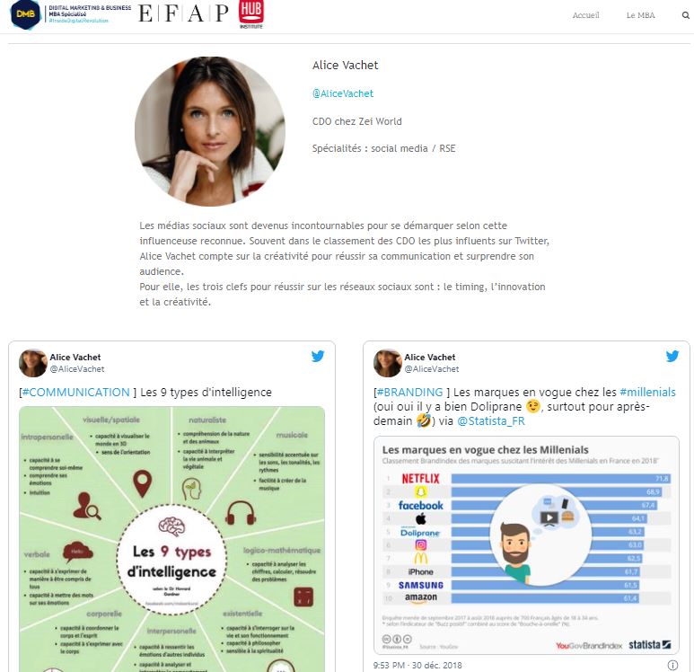 29/01/2019 – Avec plus de 48k abonnés sur twitter et 130k sur instagram, elle est apparue dans le top 3 des Chief Digital Officer les plus influents par Les Echos en 2018 et a été élue lauréate « Femme en Vue 2017 » par Voxfemina. Aujourd’hui à son propre compte pour former particuliers ou professionnels sur les médias sociaux, elle propose également des stratégies digitales personnalisées et elle intervient régulièrement en tant que speaker et maîtresse de conférence lors d’événements ciblés digital.