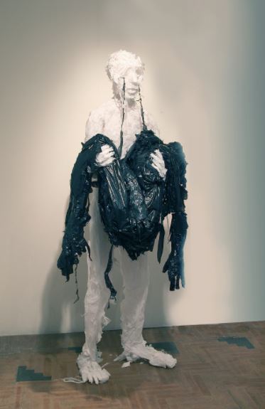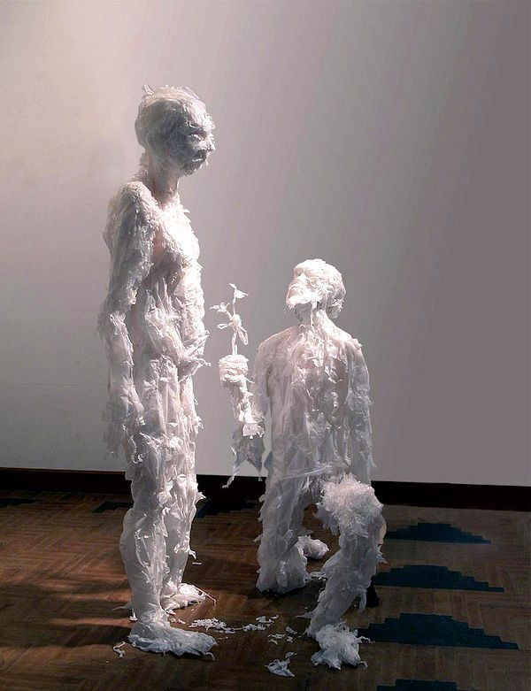 Les sacs poubelle blancs sont spécifiquement utilisés pour représenter l’âme de chacun de ses sujets, et leur fragilité pour leur donner vie.