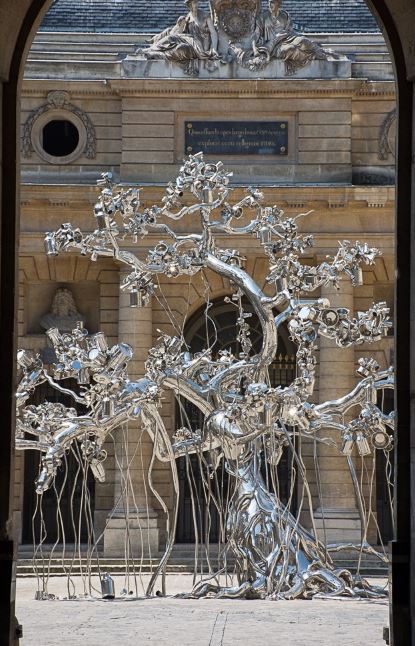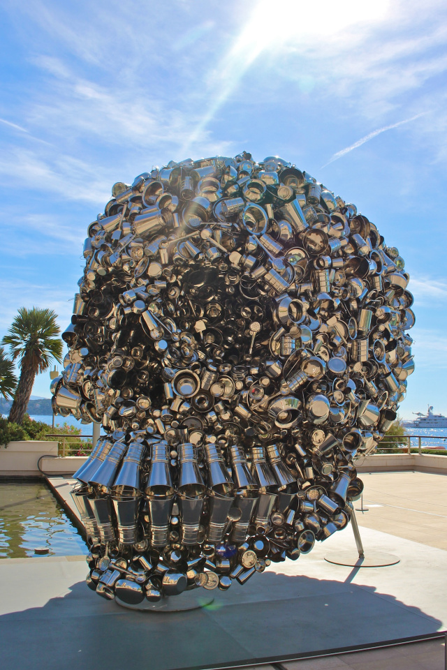 Il récupère des objets significatifs dans la culture indienne, comme des ustensiles en acier inoxydable, qu’il recycle en les intégrant à ses créations.