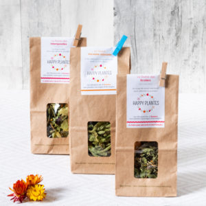 Happy Plantes c’est un partenariat avec des coopératives françaises de plantes médicinales bio, offrant des mélanges personnalisés suivant les propriétés et saveurs naturelles.