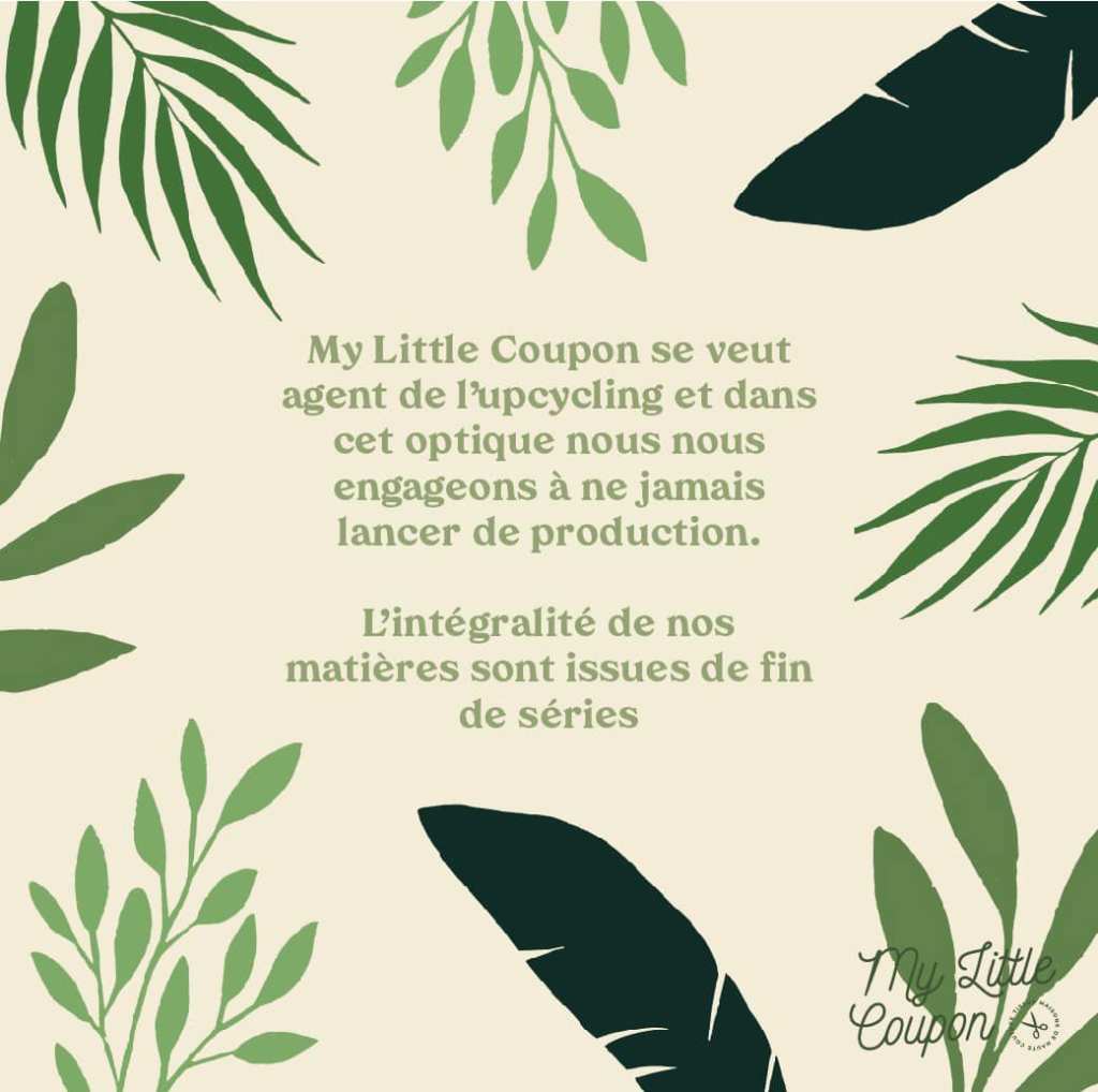 L’upcycling, action de récupérer des matières dont on n’a plus l’usage afin de de leur redonner de la valeur, est l’engagement de My Little Coupon, qui propose l’intégralité de ses matières, issues de fin de stock de maisons de haute couture et prêt-à-porter très haut de gamme françaises.
