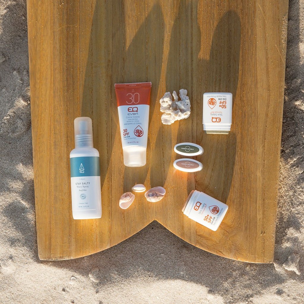 EQ propose une cosmétique naturelle Bio de soins pour la peau et les cheveux inspirés du surf, et des produits plus techniques dédiés aux sportifs.