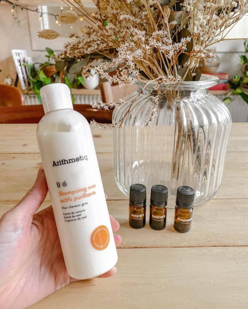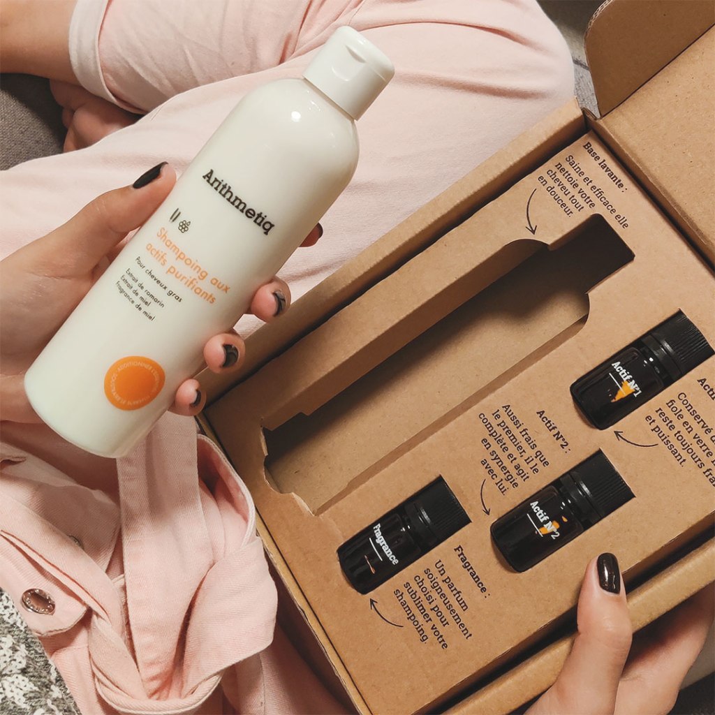 Arithmetiq conçoit des kits pour pour faire son shampoing naturel maison, avec les matières premières nécessaires dans des flacons mono-dose.