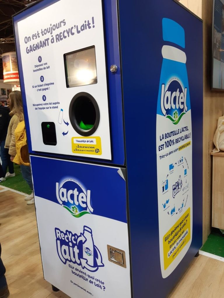 Lactel a lancé Recyc’lait, une opération de collecte de bouteilles de lait, toutes marques confondues, via des machines de consigne Lemon Tri, repensées suivant le code couleur de la marque.