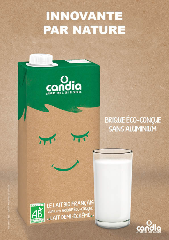 Pour son lait bio français, Candia lance une nouvelle brique éco-conçue sans aluminium, et avec 75% de carton recyclable, issu de forêts gérées durablement.