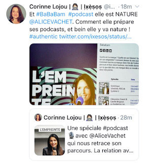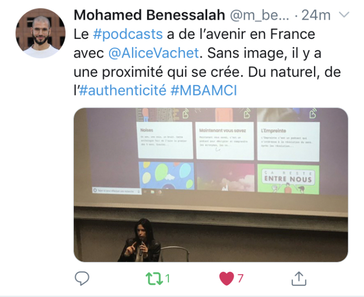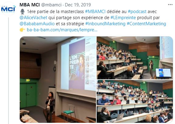 19/12/2019 – Alice Vachet anime la premiĂšre partie de la masterclass MBAMCI dĂ©diĂ©e au podcast, au PĂŽle Leonard de Vinci, en partageant son expĂ©rience L’Empreinte produit par Bababam, ainsi que sa stratĂ©gie Inonde Marketing et Content Marketing. En prĂ©sence d’autres intervenants comme LĂ©a Chamboncel et SĂ©bastien Folin.