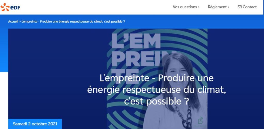 02/10/2021 – Produire une Ă©nergie respectueuse du climat, c’est possible ? Câest la question que sâest posĂ© « Lâempreinte », le podcast qui dĂ©mocratise le sujet RSE, animĂ© par Alice Vachet. Pour y rĂ©pondre, elle a conviĂ© Carine de Boissezon, directrice du dĂ©veloppement durable dâEDF.
