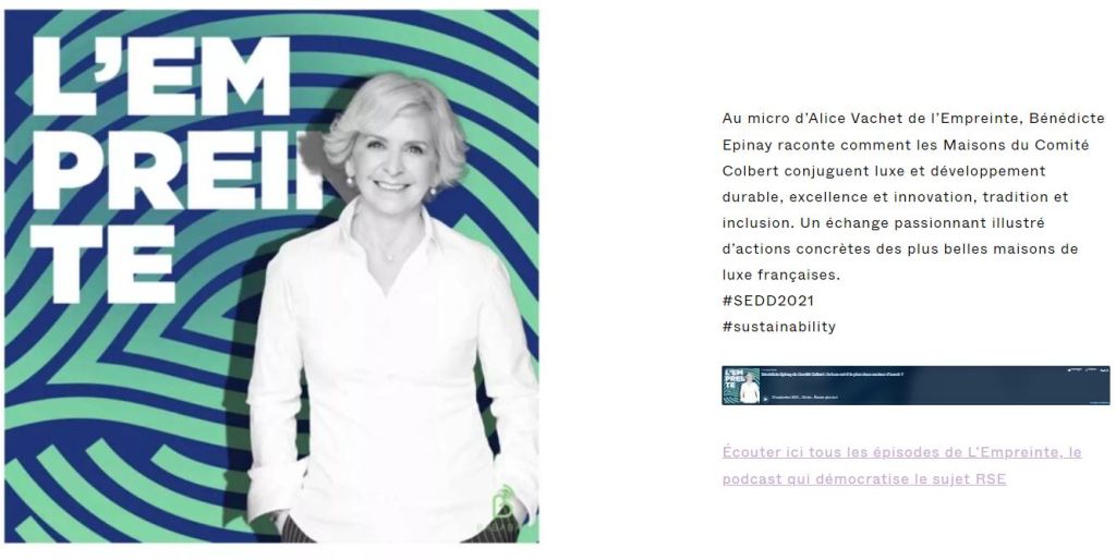 Le 01/09/2021 – Au micro dâAlice Vachet de lâEmpreinte, BĂ©nĂ©dicte Epinay raconte comment les Maisons du ComitĂ© Colbert conjuguent luxe et dĂ©veloppement durable, excellence et innovation, tradition et inclusion. Un Ă©change passionnant illustrĂ© dâactions concrĂštes des plus belles maisons de luxe françaises.