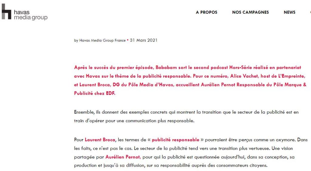 Le 31/03/2021 – AprĂšs le succĂšs du premier Ă©pisode, Bababam sort le second podcast Hors-SĂ©rie rĂ©alisĂ© en partenariat avec Havas sur le thĂšme de la publicitĂ© responsable. Pour ce numĂ©ro, Alice Vachet, host de LâEmpreinte, et Laurent Broca, DG du PĂŽle Media dâHavas, accueillent AurĂ©lien Pernot Responsable du PĂŽle Marque & PublicitĂ© chez EDF.