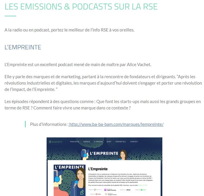 Le 13/09/2021 – « Et câest avec grand plaisir que nous vous annonçons la mise en place dâun partenariat avec le podcast LâEmpreinte, dâAlice Vachet et Bababam. Que ce soit Ă travers le micro dâAlice ou nos plumes, nous avons pour ambition de faire tĂ©moigner ceux qui sâengagent, pour faire Ă©merger les bonnes pratiques et les solutions et surtout inspirer ceux qui veulent sâengager Ă leur tour. DĂ©sormais vous trouverez dans The Good un lien vers un podcast inspirant de LâEmpreinte. »