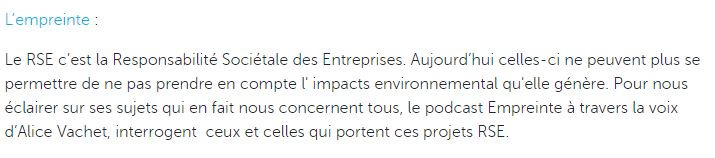 - Elle anime chaque semaine son podcast « L’empreinte », qui totalise plus d’un million d’Ă©coutes et plus de 100 Ă©pisodes: un vrai plĂ©biscite de la RSE, ResponsabilitĂ© Sociale et Ecologique.
