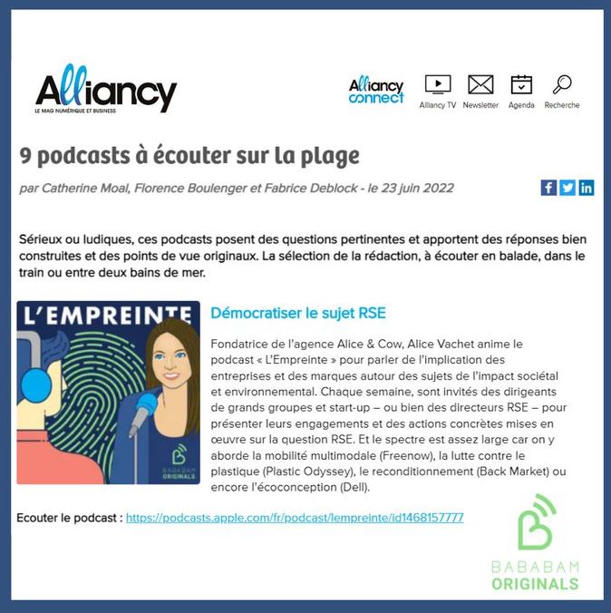L’Empreinte est un dialogue dĂ©tendu et pointu, oĂč Alice Vachet met en valeur ses invitĂ©s. Un trĂšs bon podcast pour les marques engagĂ©es !