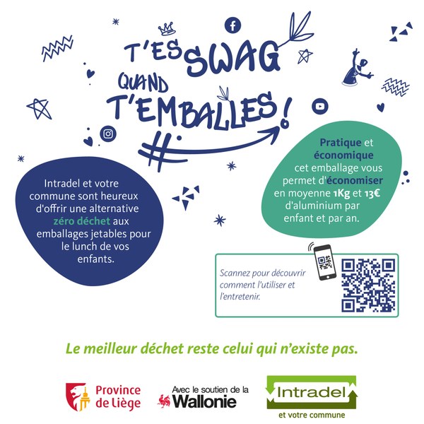Dans une démarche zéro déchet, l’association Intradel a distribué gratuitement dans les écoles de la province de Liège en Belgique, l’emballage écologique T’es Swag quand t’emballes, au design jeune & énergique.