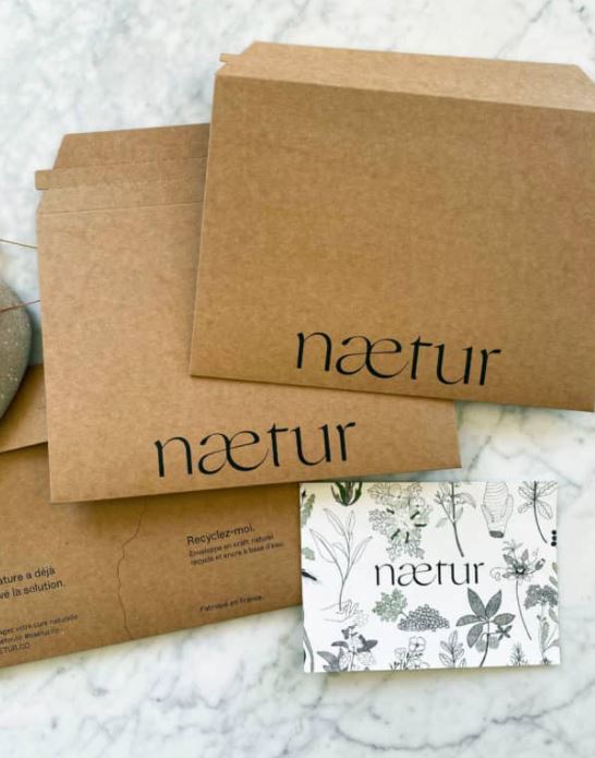 Les colis sont en papier cartonné recyclé et recyclable à 100%, et les cartes de remerciements sont issues de résidus de déchets organiques (maïs, raisins, olives).