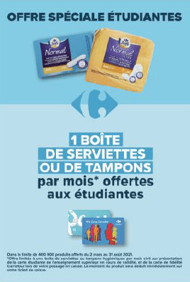 Carrefour, qui avait déjà offert aux étudiantes un paquet de protections hygiéniques par mois dans tous ses hypermarchés en février, a décidé d’étendre cette initiative à l’ensemble de ses Markets, soit plus de 1 000 magasins.