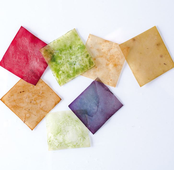 On obtient alors un matériau translucide, et en fonction des fruits & légumes utilisés, Emma peut lui donner des couleurs ainsi que des textures différentes.