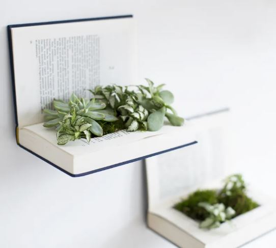 Enfin, fixez deux équerres parallèles directement au mur, et posez à même ces équerres le livre végétal, puis vissez le par en dessous à l’aide de petites vis. Votre livre est maintenant fixé au mur de manière à obtenir de jolies étagères végétales.