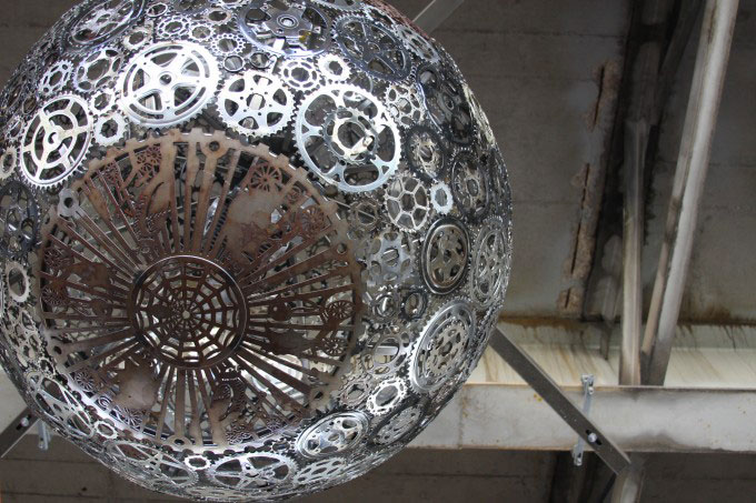 Ballroom Luminoso , l’œuvre fabriquée à partir de pièces de vélo recyclées, par les artistes Joe O’Connell et Blessing Hancock, utilise des images adaptées du jeu de cartes mexicain La Lotteria.
