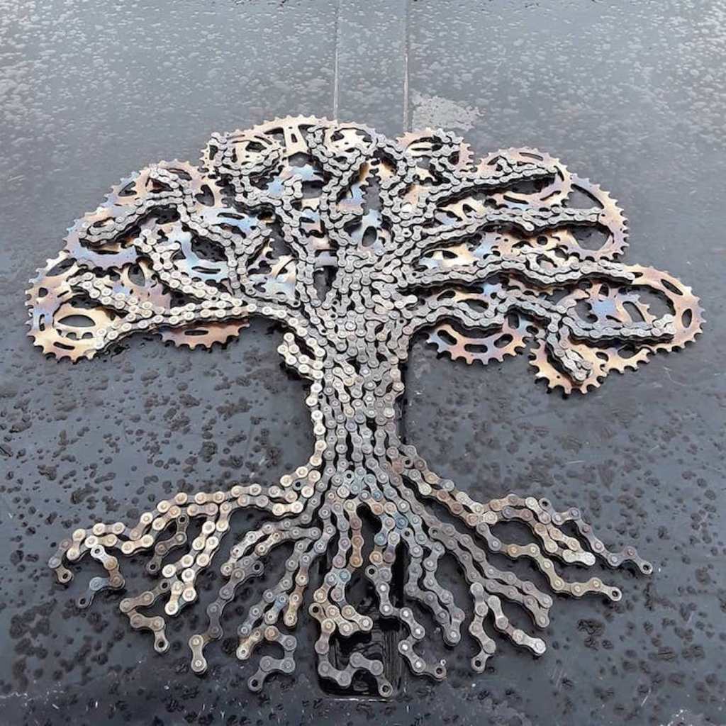 Plus qu’un simple art du métal, en récupérant es chaînes et pignons de vélo désaffectés, Evans promeut ainsi le recyclage des déchets.