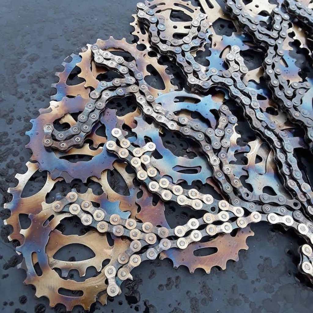 “I love working with scrap bicycle chains and sprockets in particular for a plethora of reasons, including the fact that they are highly conducive to geometric designs, and they come in a variety of metallic finishes that often take on colorful patinas when heated.”