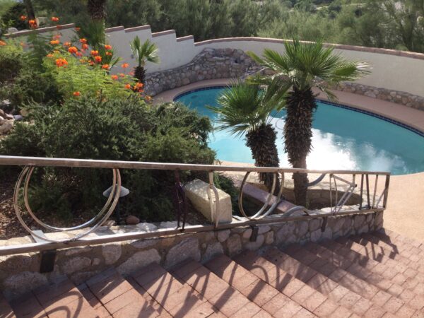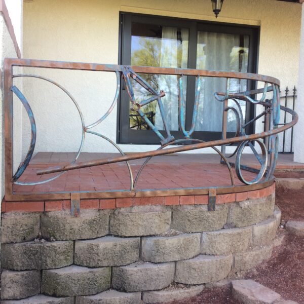 Leoni a collecté différentes pièces: cadres, fourches, roues,… Autour du socle en brique, il a créé une « sculpture » enveloppante avec une main courante descendant jusqu’à l’endroit où notre chien pouvait se soulager.