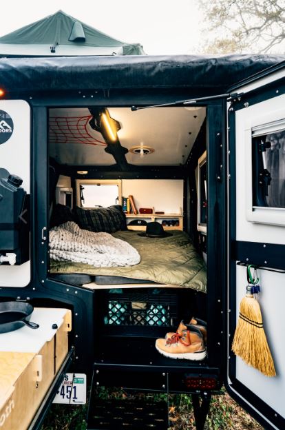 MalgrĂ© sa petite taille et son extrĂȘme lĂ©gĂšretĂ©, cette roulotte Ă©cologique dispose dâun coin bureau, d’une chambre pour 2 adultes (+3 avec une tente sur le toit en option) et dispose d’une cuisine de camp coulissante avec un rĂ©chaud portable Ă deux brĂ»leurs.