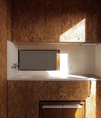 Sous la kitchenette, sont stockés une petite table et 2 tabourets. Les murs en liÚge sont doublés avec des panneaux de particules de bois.