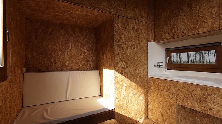 Cet habitat cubique, construit avec des matĂ©riaux durables et recyclables (liĂšges, panneaux de particules de bois..), inclue une porte vitrĂ©e ainsi que trois petites fenĂȘtres, qui offrent une trĂšs belle luminositĂ© intĂ©rieure. Le petit espace disponible a Ă©tĂ© optimisĂ© au maximum, afin de pouvoir accueillir les Ă©quipements essentiels Ă la vie quotidienne : un banc pliant (pouvant faire office de lit), des toilettes et une kitchenette.