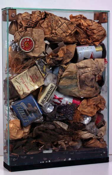 Dans sa série poubelles, au début des années 1960, il s’amuse à choquer le bourgeois en mettant en vitrine des rebuts, leur conférant un statut d’œuvres d’art.
