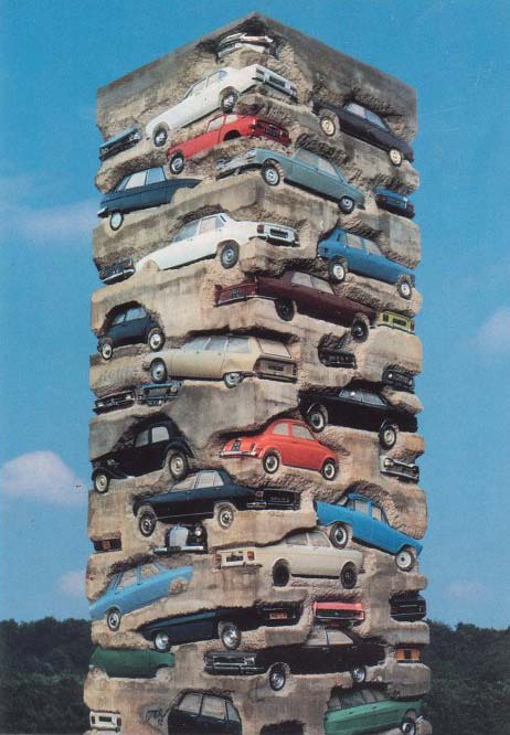 Pour sa célèbre et monumentale sculpture Long-Term Parking (1982), l’artiste empile 60 voitures et les plonge dans du ciment, créant alors une structure surréaliste imposante
