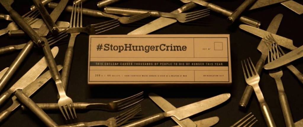 La campagne #StopHungerCrime utilise des couverts fabriquรฉs ร partir d’armes de guerre recyclรฉes pour alerter l’opinion publique sur cette cause.