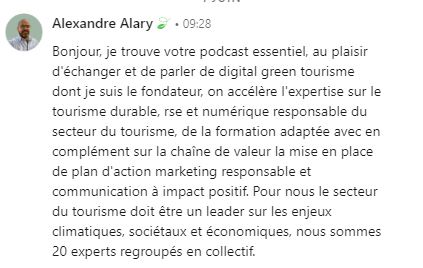 Belle découverte. Je découvre et écoute avec plaisir ! Vous devriez contacter CASTALIE pour comprendre comment ils répondent aux enjeux RSE.