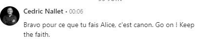 Des invités talentueux qui partagent leurs parcours, leurs expériences, succès et échec et leur engagement. Beaucoup de bienveillance apportée par Alice Vachet. J’adore