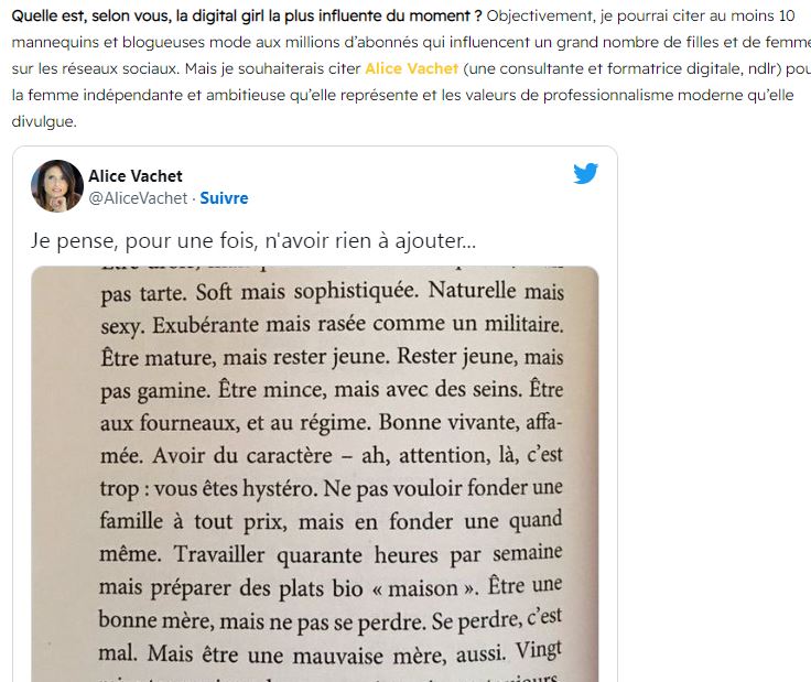 Quelle est, selon vous, la digital girl la plus influente du moment ? Objectivement, je pourrai citer au moins 10 mannequins et blogueuses mode aux millions d’abonnés qui influencent un grand nombre de filles et de femmes sur les réseaux sociaux. Mais je souhaiterais citer Alice Vachet (une consultante et formatrice digitale, ndlr) pour la femme indépendante et ambitieuse qu’elle représente et les valeurs de professionnalisme moderne qu’elle divulgue.